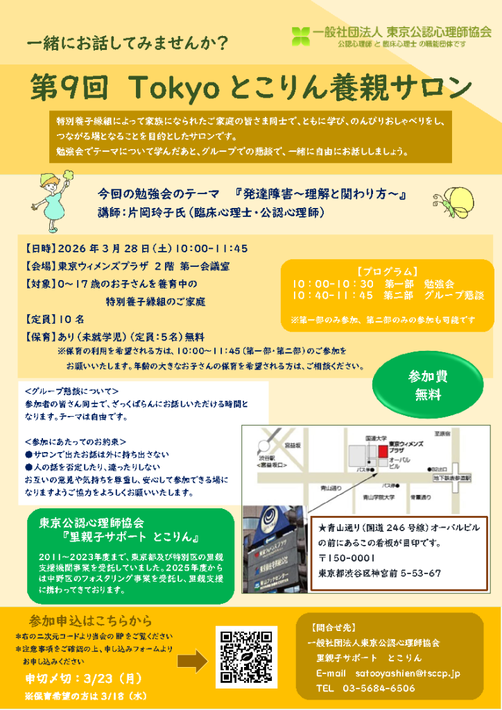 里親子サポートとこりん企画 第9回Tokyoとこりん里親サロンのご案内